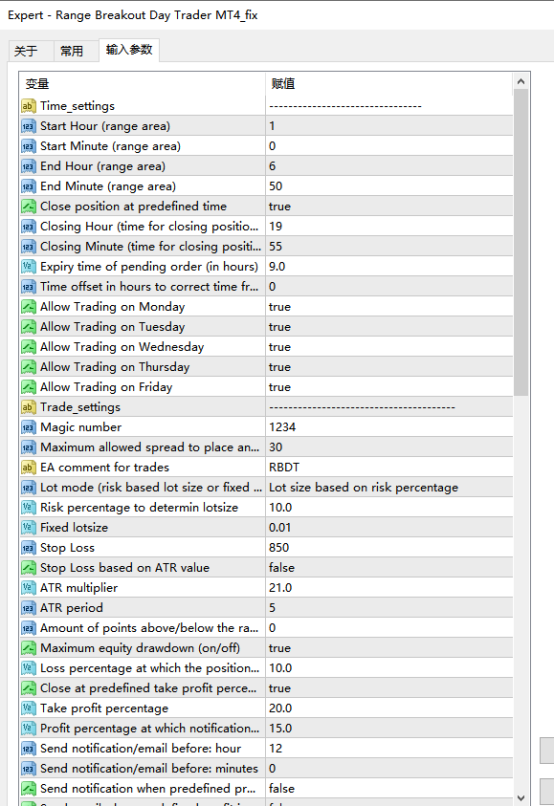 • 允许交易日:打开/关闭 EA 允许交易的日子