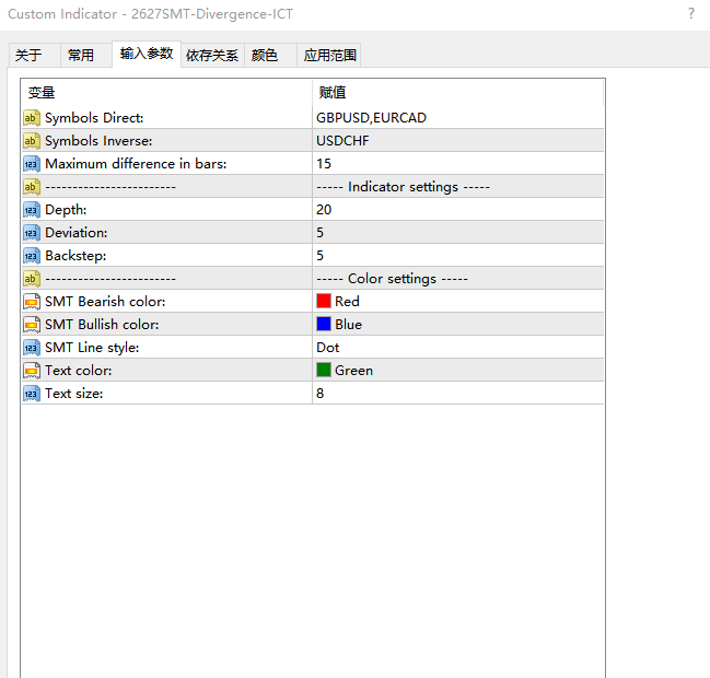 五、附加功能 1、可配置的相关对:允许用户明确定义直接交易品种(例如英镑兑美元、欧元兑加元)和反向交易品种(例如美元兑瑞郎),以进行量身定制的市场间分析。 2、最大柱线差异控制:“柱线的最大差异”参数允许背离之间的最大柱线偏移,有助于同步时间范围并检测细微的变化。 颜色和文本定制:提供对 SMT 看跌颜色、SMT 看涨颜色、SMT 线条样式、文本颜色和文本大小的完全控制,以实现图表的可读性和个性化美感。 3、最小的图表混乱:旨在提供机构级精度,而不会因不必要的指标而压垮图表。 4、与价格行为和流动性概念的兼容性:与涉及市场结构转变、流动性扫描、公允价值缺口 (FVG) 和基于风险的止损/止盈配置的策略无缝集成。