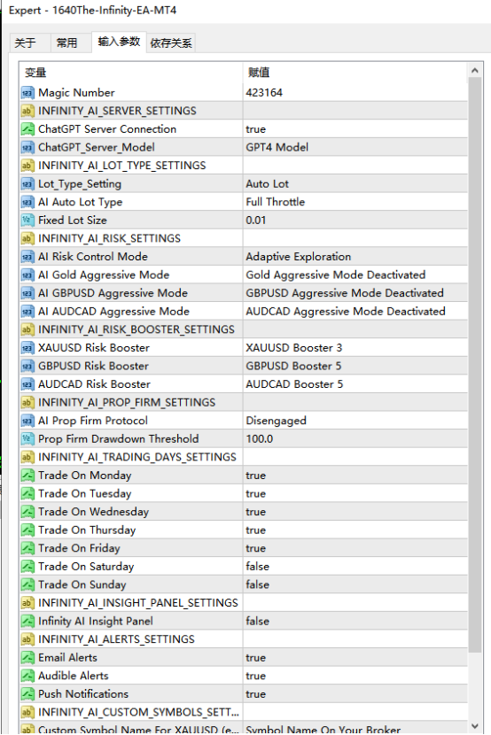 The Infinity EA Expert Advisor Inputs