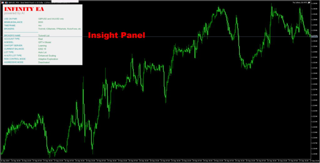 • Insight Panel: An advanced Insight Panel displays crucial real-time data, offering recommendations and showcasing current account conditions and EA settings.