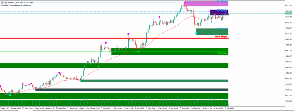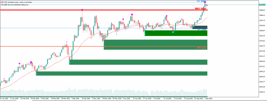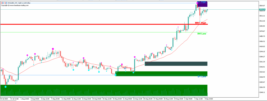 1、第一步(识别供应区/阻力位):找到当前价格上方的红色/紫色填充区域(供应区),或者重要的水平阻力线(例如D1 High、MN1 High)。