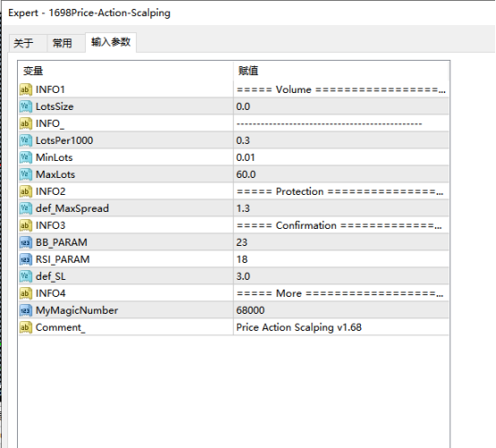 • 魔术数(MyMagicNumber=68000):用于区分EA生成的订单,避免与手动交易混淆。