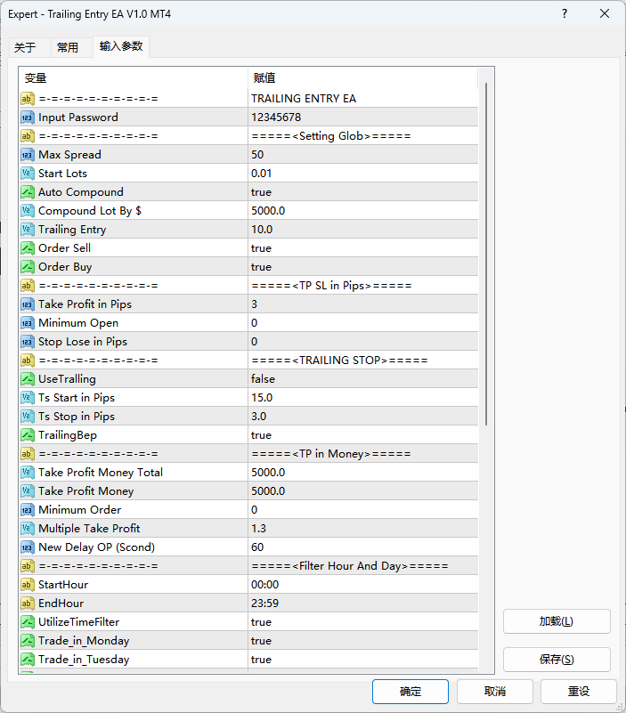 1. 仓位管理: EA支持可调节的手数设置、最大交易数量限制以及止损水平配置。