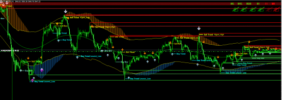 例如,一个完美的买入信号是:图表背景为蓝色。出现蓝色向上箭头。K线下方出现蓝色圆点。副图震荡器是蓝线上穿红线或蓝线在红线之上。