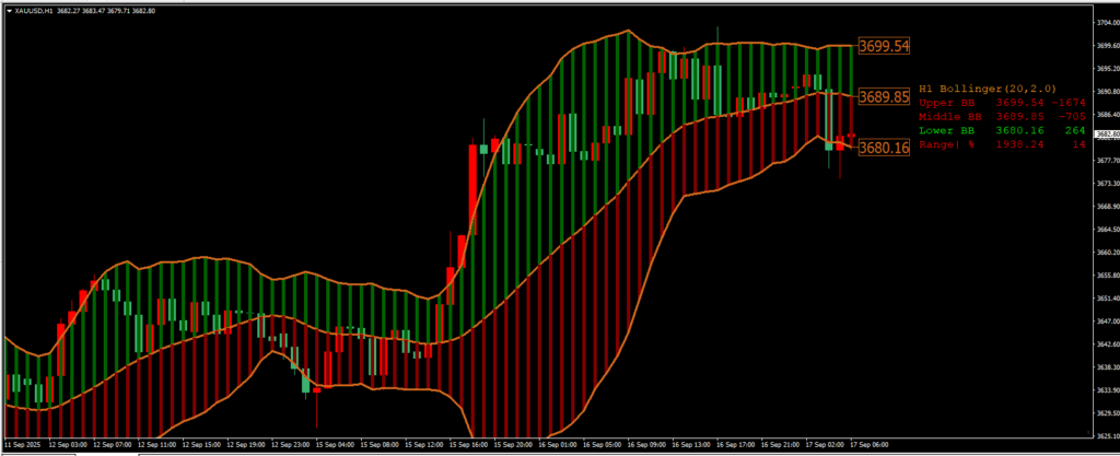 中期趋势线,数值如 “3688.62”;颜色动态变化(绿色 = 多头趋势,红色 = 空头趋势)。