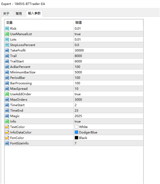 1、自定义可视化界面:支持调整图表显示参数(TextColor=白色、InfoDataColor=道奇蓝、FontSizelnfo 123=7),实时交易信息(如订单状态、盈利数据)直接在MT4图表上展示,行情与交易动态一目了然;